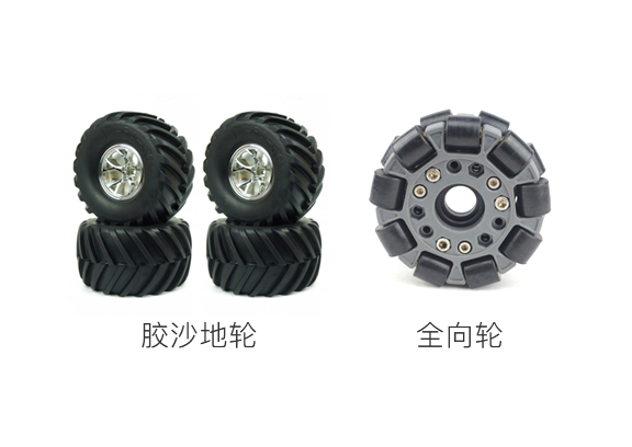 • 本套件包含兩種驅動輪,一種適合常規室內路面的全向輪,一種是適合特殊路面的沙地輪。可使用鏈條傳動件機構,也兼容四輪電機直驅結構。